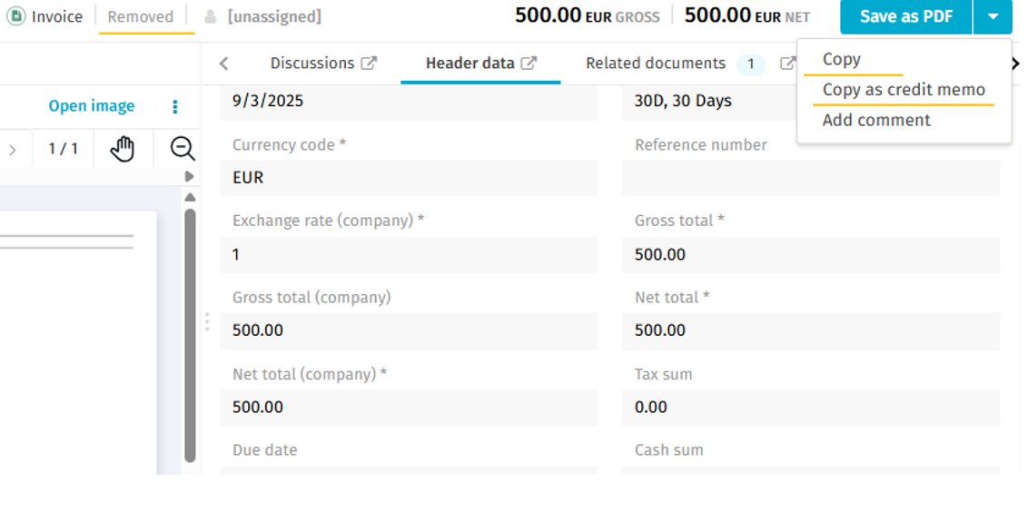 - When an invoice is already in Removed status, you can also copy the invoice as a new invoice. There is no need to raise Support cases to change the invoice status when the invoice was removed by mistake e.g.