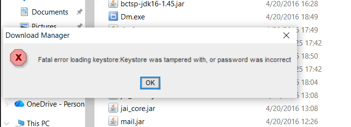 Open Download Manager and confirm if the following error occurs: Fatal error loading keystore: Keystore was tampered with, or password was incorrect