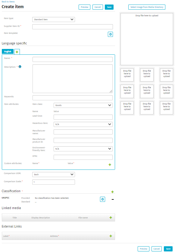 Once the mandatory fields have been completed with valid data you can either Save or Preview the item. Actions you can perform on this page are listed below.