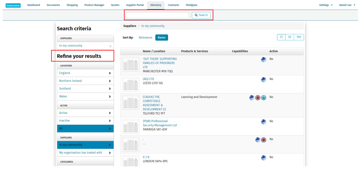 You can also narrow down your search by location, if you have previously traded with the supplier before and by category. Category relates to what the supplier offers, for example construction, or legal aid.