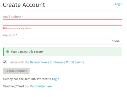 If you are trying to create an account into the Basware Portal and you get the message "Username already exists", it means that this users name has been already used in the past for a registration for the PDF E-Invoicing Service.