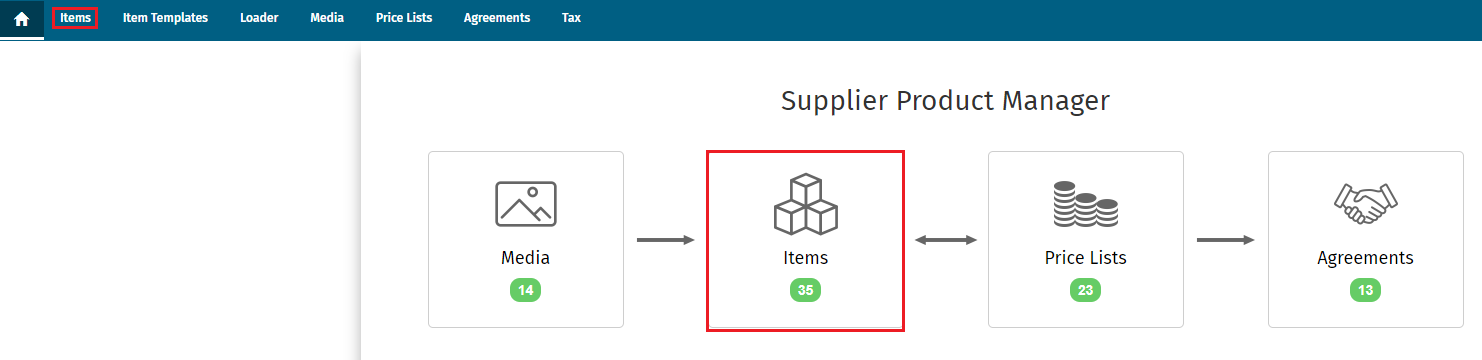From Product Manager, select either of the Items options to go to the Items directory: