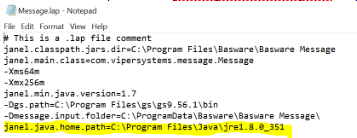 - Suchen Sie die Java Launcher-Konfigurationsdatei für Basware Message, die standardmäßig in:"C:\Program Files\Basware\Basware Message\Message.lap" installiert ist.