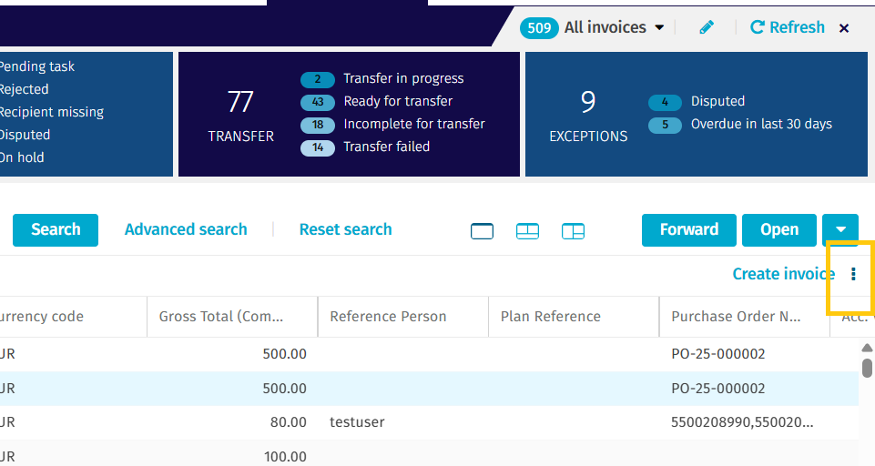 - If you want to export the invoice list or customize the columns displayed (for example, Invoice Type, Gross Amount, Reference Person), follow the steps below.
