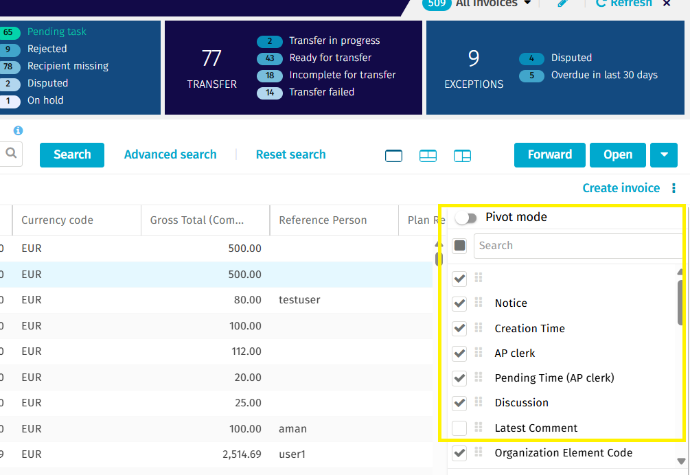 7. You can now view or export the invoice list with the columns of your choice.
