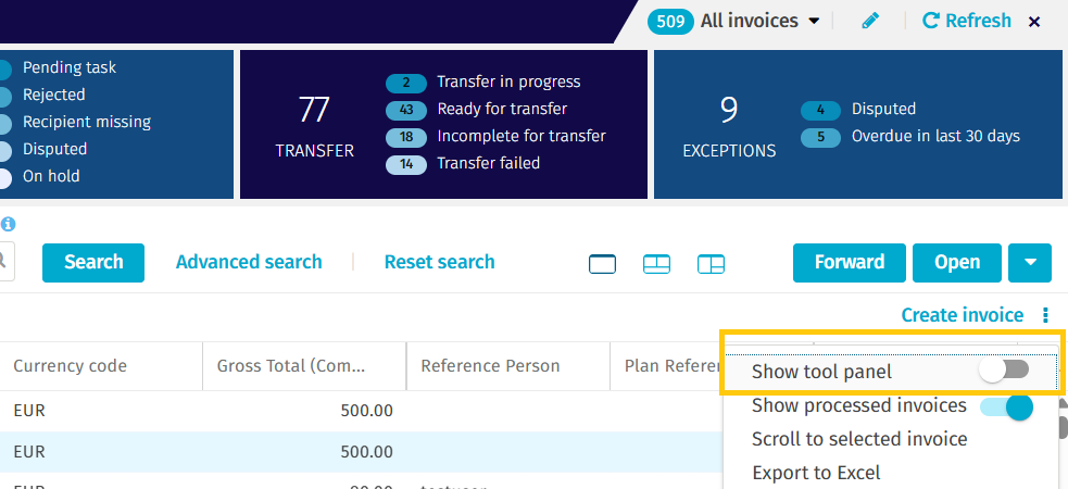6. Once the required fields are selected, disable the Show Tool Panel toggle by clicking the three dots next to the Create Invoice button again.