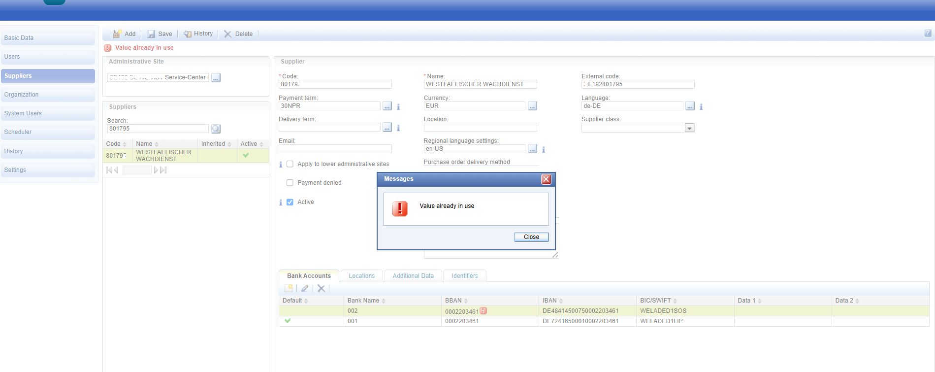 - When a BBAN already exists in the system for the same supplier, the system displays the error message “Value already in use.”