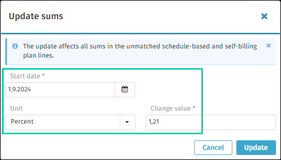 In case spend plans have small or no tolerance, the gross sum should be updated to reflect the new totals. This can be done from the list view by selecting all Schedule-based spend plans where Sum Type = Gross, select Update Sums, select Start Date 1.9.2024, and add the increase in %.