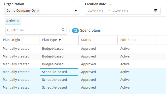 This has to be done separately for each type of spend plans (budget, schedule, self-billing). In case tax codes are company specific, only invoices from one company can be selected in one mass update.