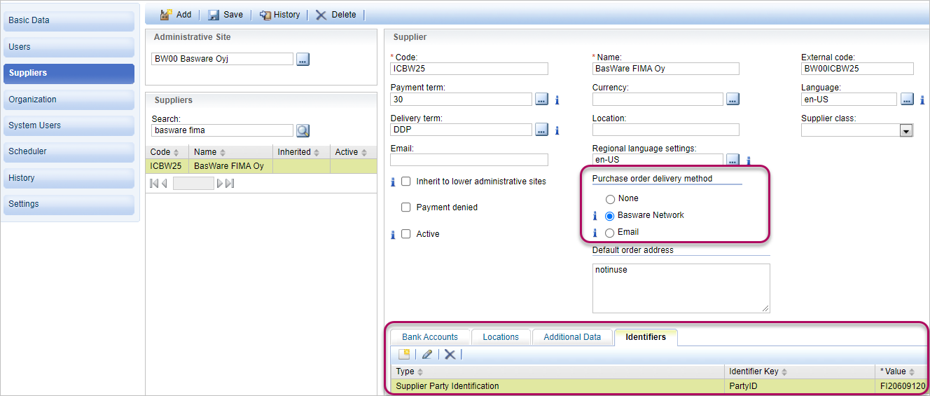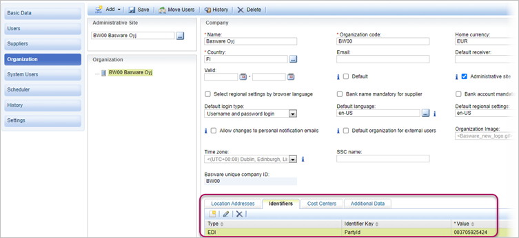 When sending electronic business documents, both the sender and the receiver must be known and must be unique within the business network, like Basware Commercial Network (BCN). For this purpose, Basware Procurement uses Identifiers, also known as Party Identifiers.
