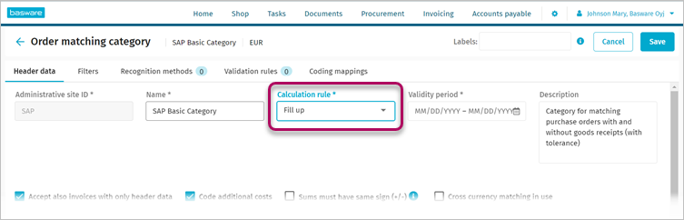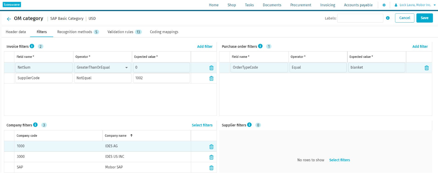 To complete the configuration, an Order Matching Category must be created to separate normal purchase orders from blanket orders. For blanket orders, OrderTypeCode must be set as "blanket".