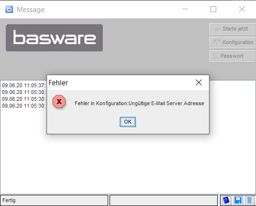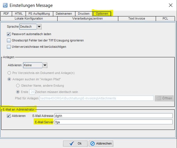Prüfen Sie das markierte Feld "E-Mail Server" und korrigieren Sie die danach eingetragene Information. Sie können auch den Haken für "Aktivieren" entfernen, falls E-Mail-Benachrichtigungen an den Administrator nicht notwendig sind.