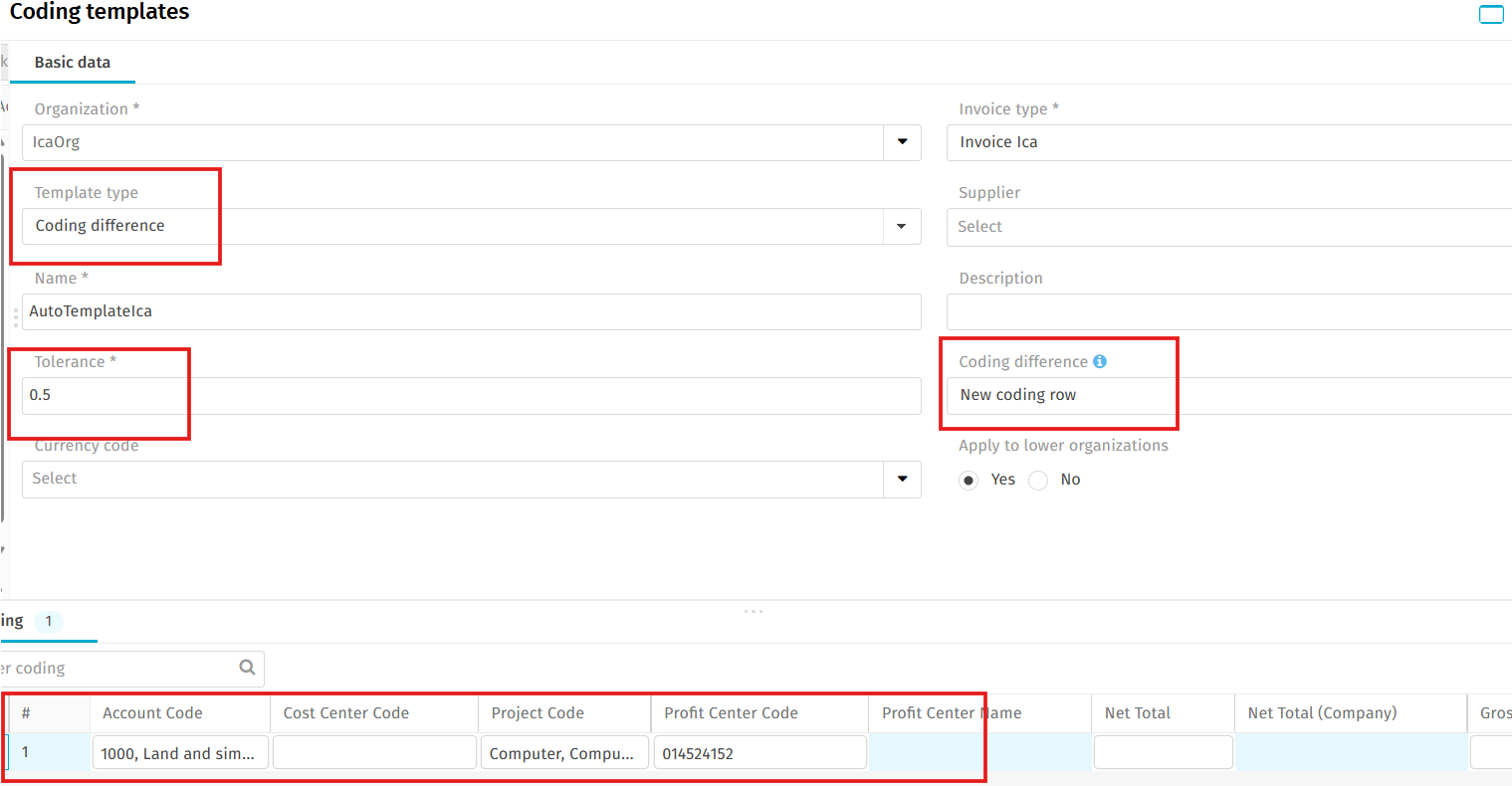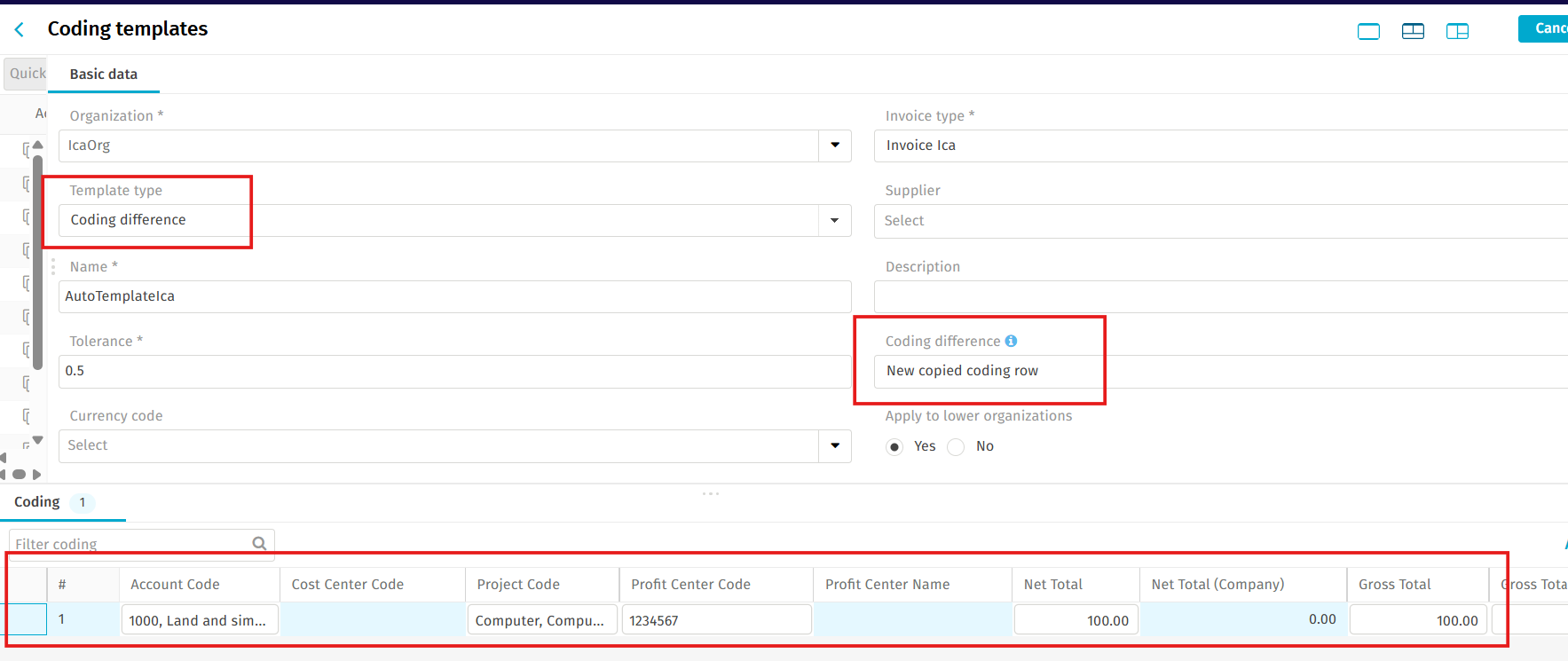 If invoice coding difference exists within the tolerance set in the New coding line template, then the coding difference will get adjusted in the new coding row. The new coding row will have all those values that were set by the user in the New coding line template, like Account Code, Cost center code, Last comment, and Project code. Sum-related values will be ignored.