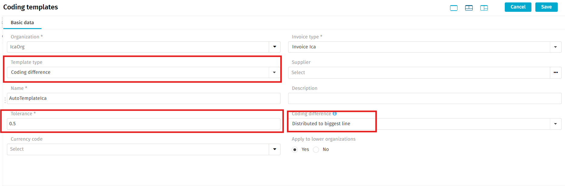 When the option "Distributed to the biggest line" is selected, a value must also be given to the Tolerance field. If the coding difference exists within the tolerance set in the coding template and at least one coding row exists in the invoice, then the coding difference will get adjusted to that row. In case there is more than one coding row, then the difference will get adjusted to the row having the biggest sum.