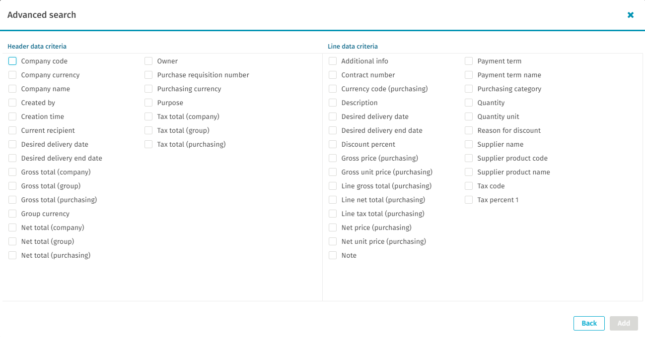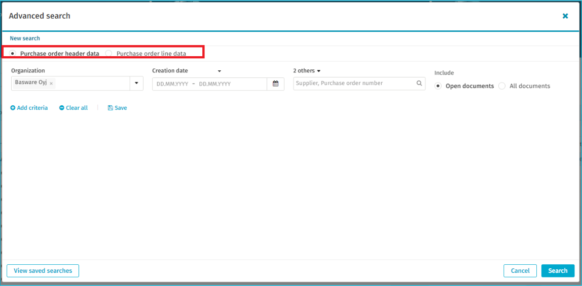 When opening the advanced search dialog, there are search options: Purchase order header data and Purchase order line data.