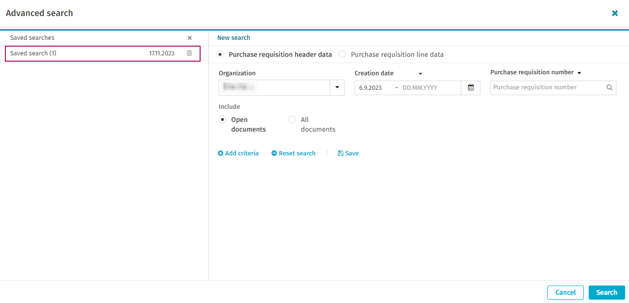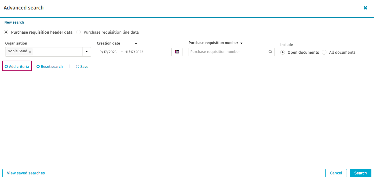 To add search criteria, click Add criteria. It is possible to add additional criteria when only one organization is selected. When multiple organizations are selected for the advanced search, it is not possible to add additional criteria.