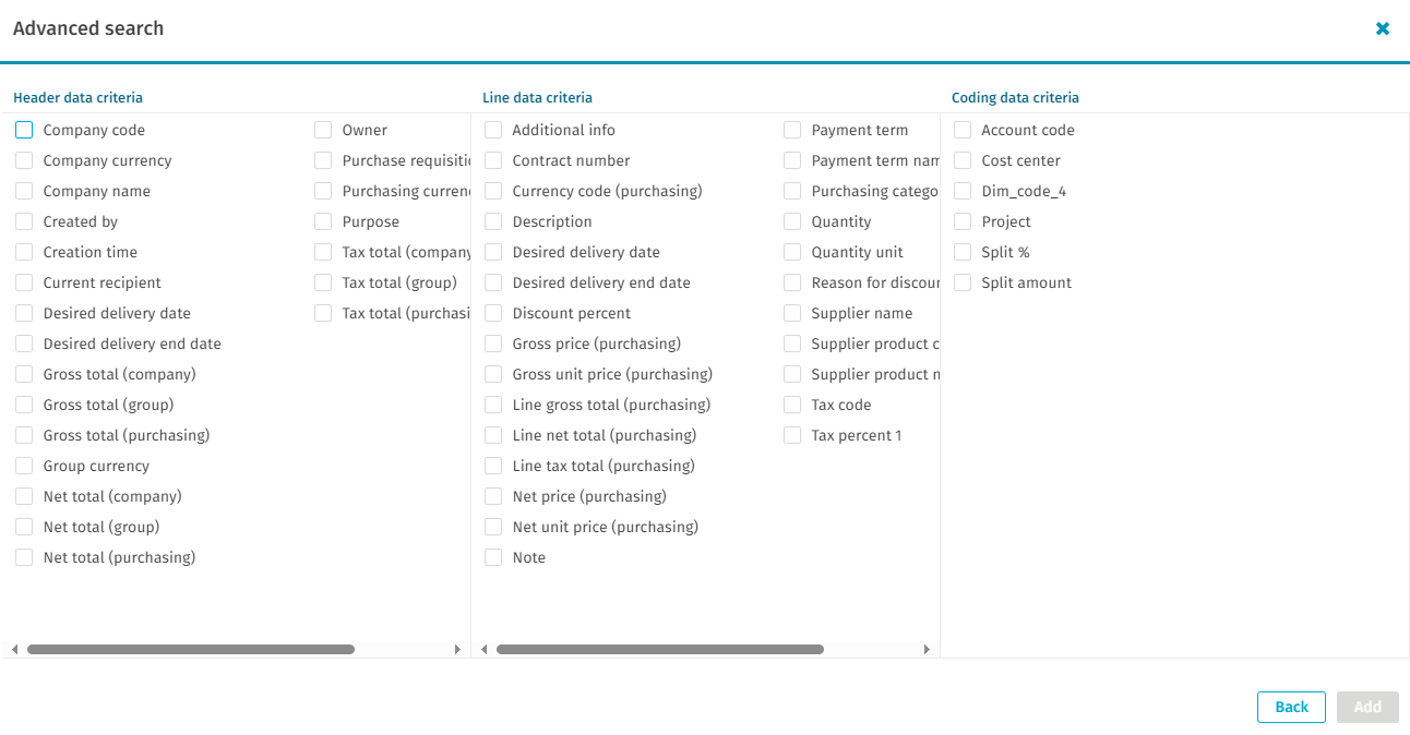 Purchase order header data search allows to search orders based on header and line data. Purchase order line data search allows to search orders based on also the coding data. The result of this search shows the number of orders that match the given criteria.
