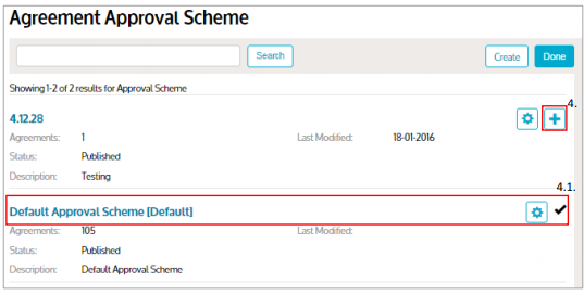 To add the scheme to your Agreement, click the ‘+’ icon against the required Scheme. The Scheme selected will then display a ‘tick’ to indicate it has been selected and the number of Agreements it is associated to will increase by one. You will see the Default Approval Scheme already selected.