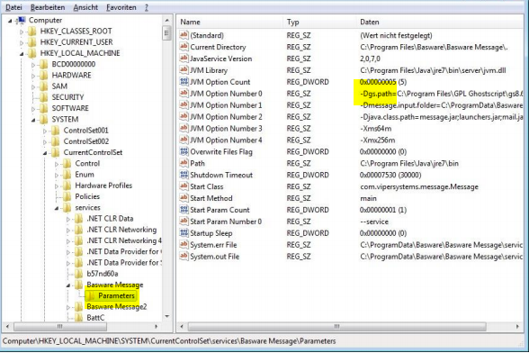 - Go to HKEY_LOCAL_MACHINE\SYSTEM\CurrentControlSet\services\Basware Message\Parameters;