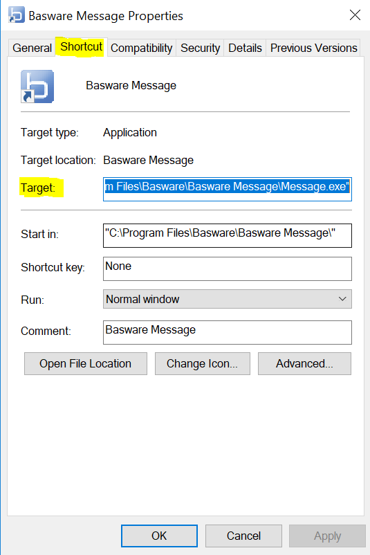 - Right Click on the Basware Message icon on your desktop and select Properties;