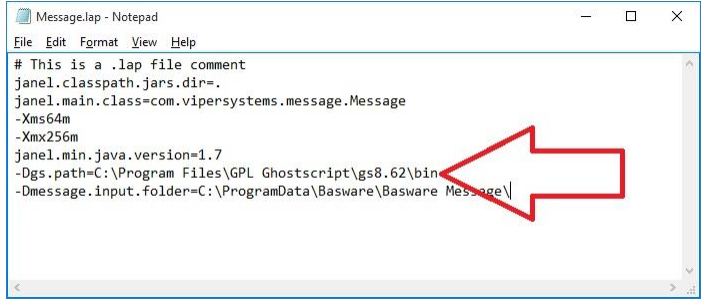 - Open the file Message.lap (and MessageService.lap if you are using the Basware Message Service) and find the entry -Dgs.path=;