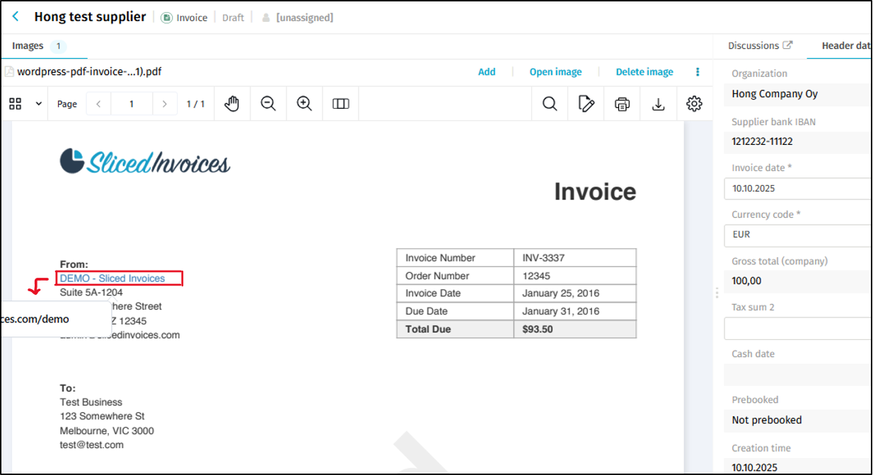 In the invoice below, the text “DEMO-Sliced Invoices” still looks like a hyperlink.
