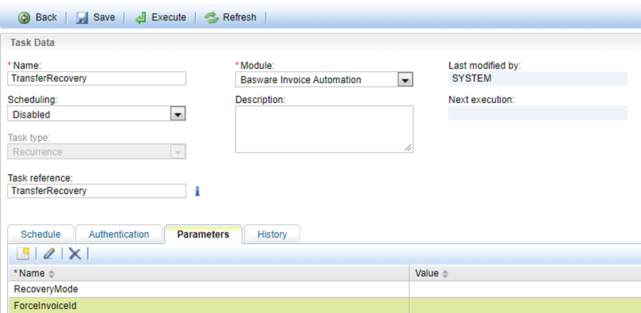 - On the Parameters tab, select the parameter "ForceInvoiceId" and click