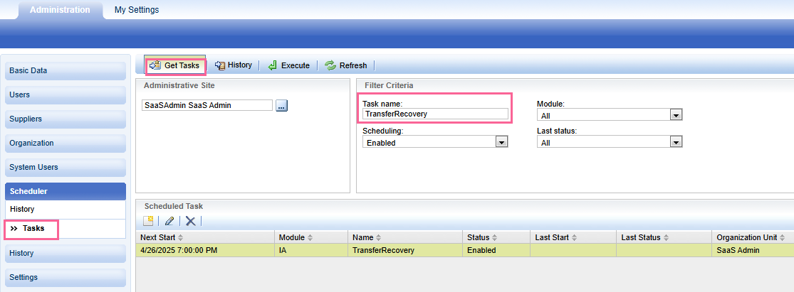 - In Filter Criteria, search by Task name "TransferRecovery".