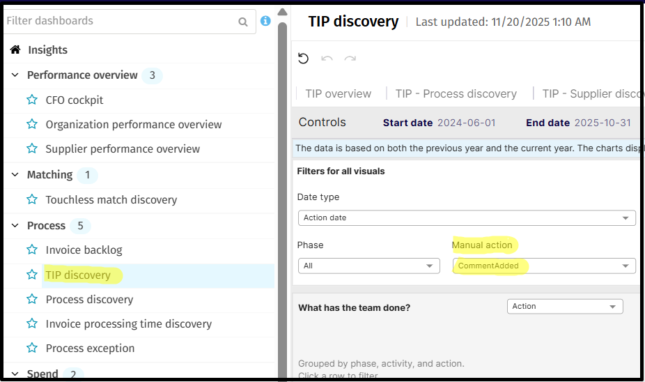 As a result, invoices with comments only will not appear in the TIP Team Performance Discovery Dashboard > Manual Actions.