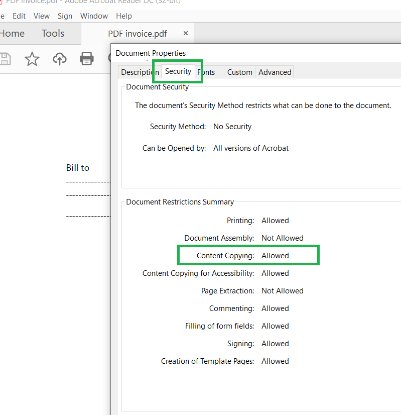 Basware cannot process secured PDFs. Secured PDF does not only mean that PDF is password protected. Apart from PDF not being read protected, Basware also requires 'Content Copying' to be allowed for secure PDFs. Right-click on the PDF file, open the properties of the PDF document and check the security settings. Below screenshots describe the correct security settings and PDF versions accepted by Basware: