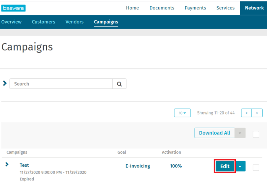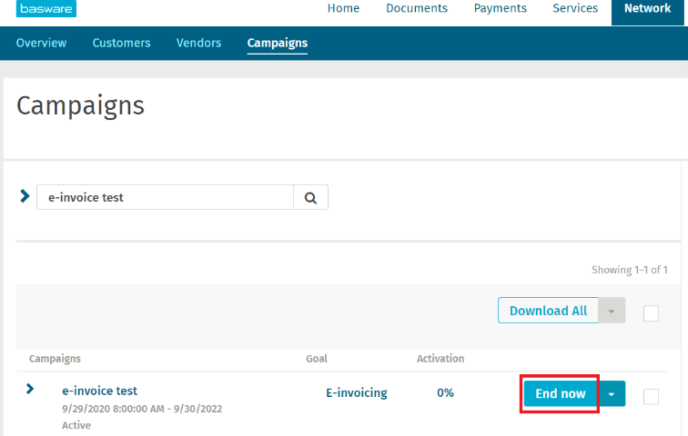With the Basware Portal campaign tool, you can invite your business partners to send invoices to your company. Campaigns are managed in the Campaigns view within the Network section. With this tool you can create two kinds of campaigns, which are explained in more detail in the next answer.