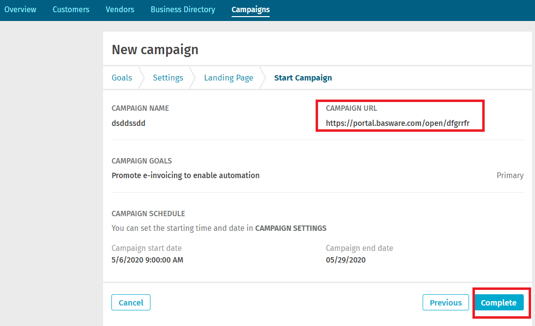 - Your Open campaign has been created. Please click on Complete.