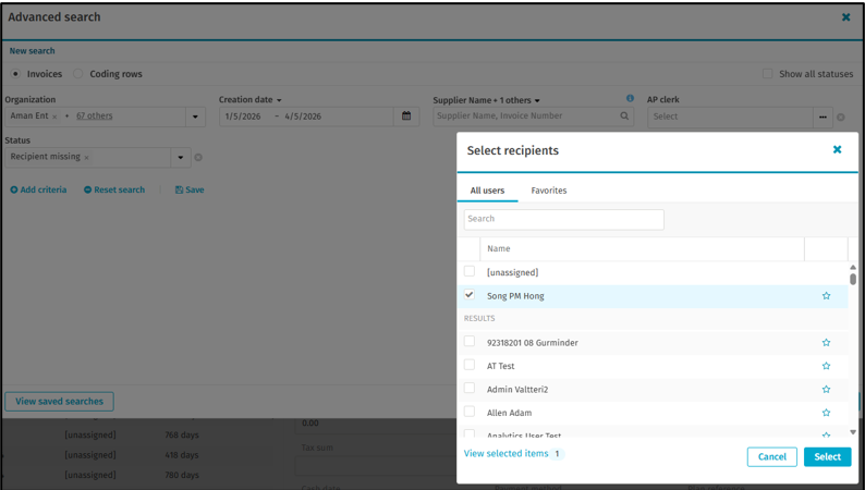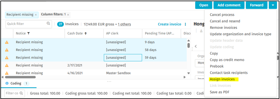 As per the example below, AP user can assign the Recipient missing invoices to an AP clerk so he/she can release the stuck invoice from the current workflow step.